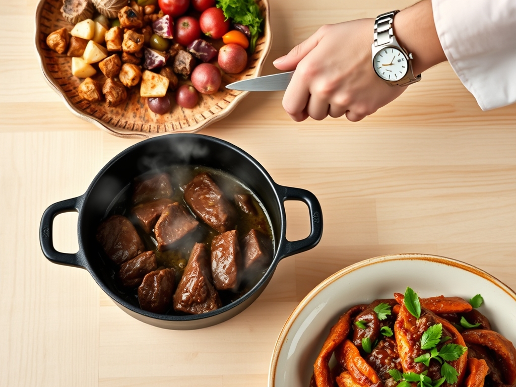Efficiency in the kitchen is about the Chef's Flow. This process takes approximately 3.5 hours from start to finish. Your active prep time is 30 minutes; this involves trimming the silver skin from the beef with a sharp boning knife and dicing your aromatics. The "Searing Phase" takes 15 minutes, followed by a 2.5-hour "Quiet Braise." During the final 30 minutes, you will add the fruit and honey to allow the sauce to reduce and become viscous. Respecting this timeline ensures the connective tissue reaches its thermal breakdown point without overcooking the delicate fruit.
