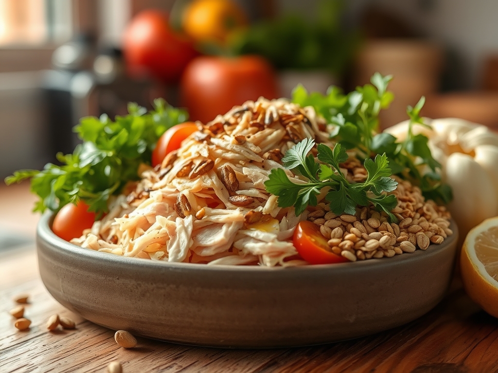 Arrange shredded chicken over a base of farro or freekeh. Add roasted broccolini, shaved Brussels sprouts, pomegranate arils, and a tahini-lemon dressing. Finish with toasted pepitas and a wedge of lemon.
