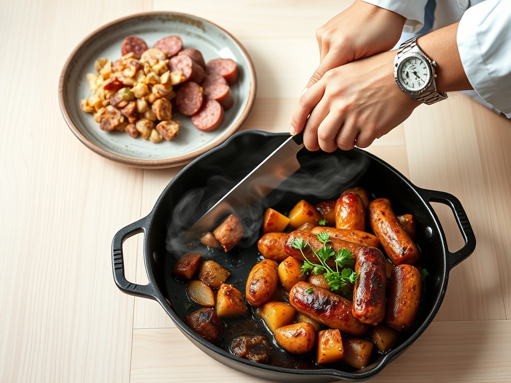 When reheating, do not use the microwave on high power. The intense radiation can cause the fat in the sausage to "pop" and dry out the potatoes. Instead, use a saucier on the stovetop over low heat. Add a tablespoon of water to create steam, which will re-hydrate the starches and return the dish to its "day-one" glory.